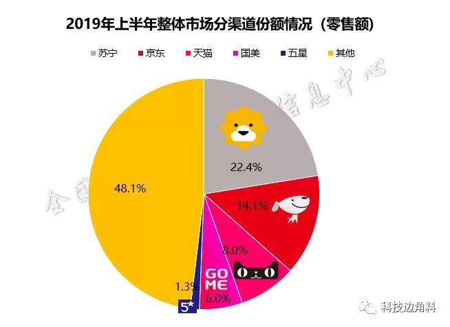 众所周知,苏宁是主营家电数码零售业巨头,近日中国家用电器研究院和全国家用电器工业信息中心联合发布《2019年中国家电行业半年度报告》,指出今年上半年国内家电市场零售额累计4125亿元,而在家电全渠道形态中苏宁易购获得22.4%的市场份额,略高于去年的22.1%,苏宁除了再次领跑全渠道,也进一步扩大在家电行业老大地位。