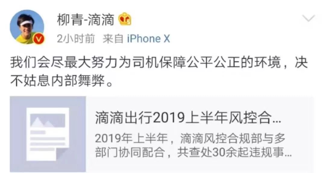 滴滴总裁柳青则表示:“我们会尽最大努力为司机保障公平公正的环境,决不姑息内部舞弊。”