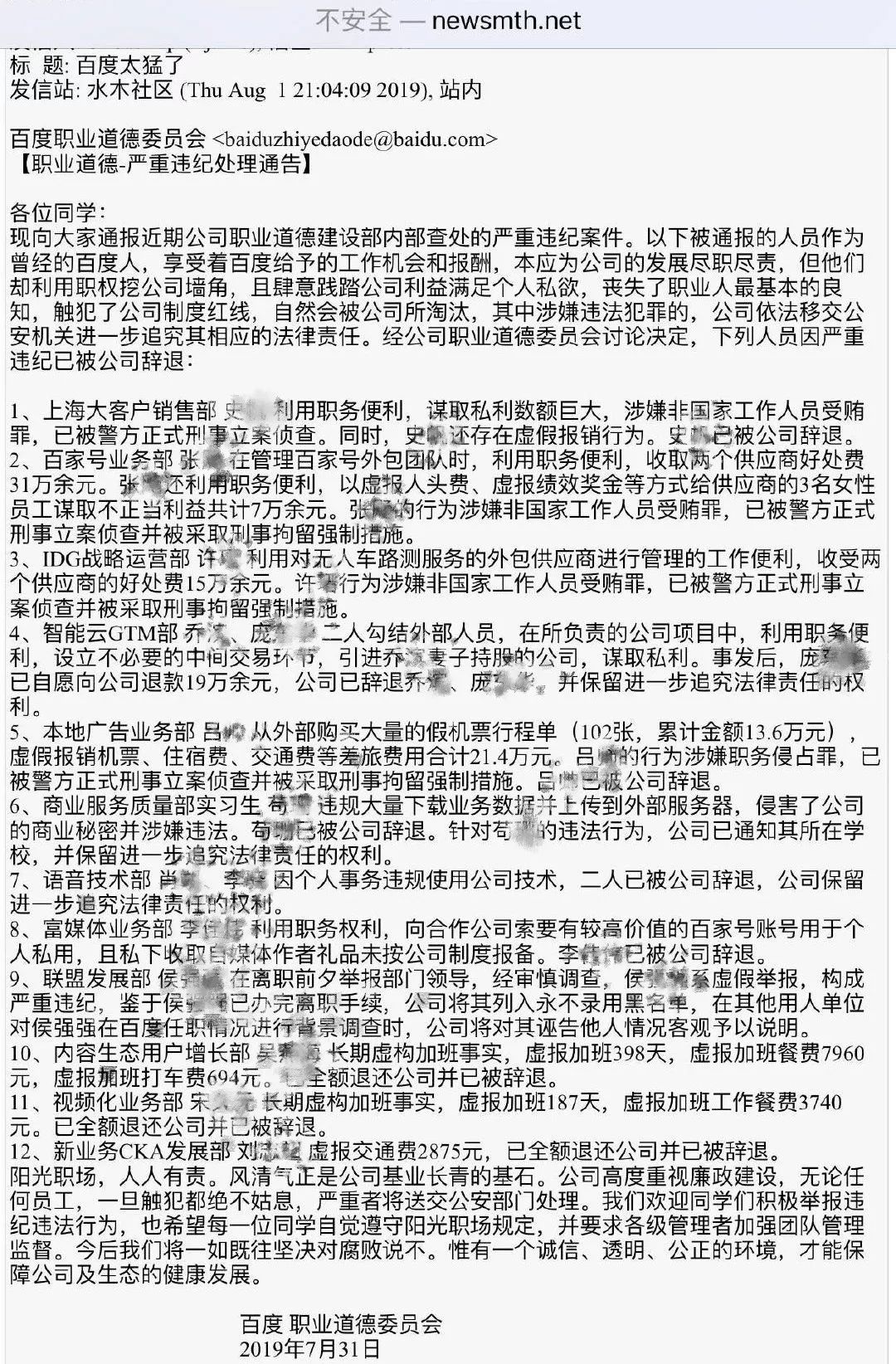 百度通报内部12起严重违纪