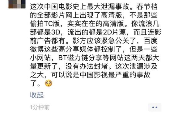 “一般第一天就开始有盗版,对电影来说也不稀奇,但都是枪版,那种画质很差的,现在有要求观众也未必愿意看。但今年是所有片子一起出来高清,这个是太不寻常了,而且传播的渠道特别多,这两天我手机、微信,时时刻刻在收到朋友给我发来的盗版链接,不只是从事影视的朋友,普通亲戚都能到处看到转发给我。传播的特别多。”