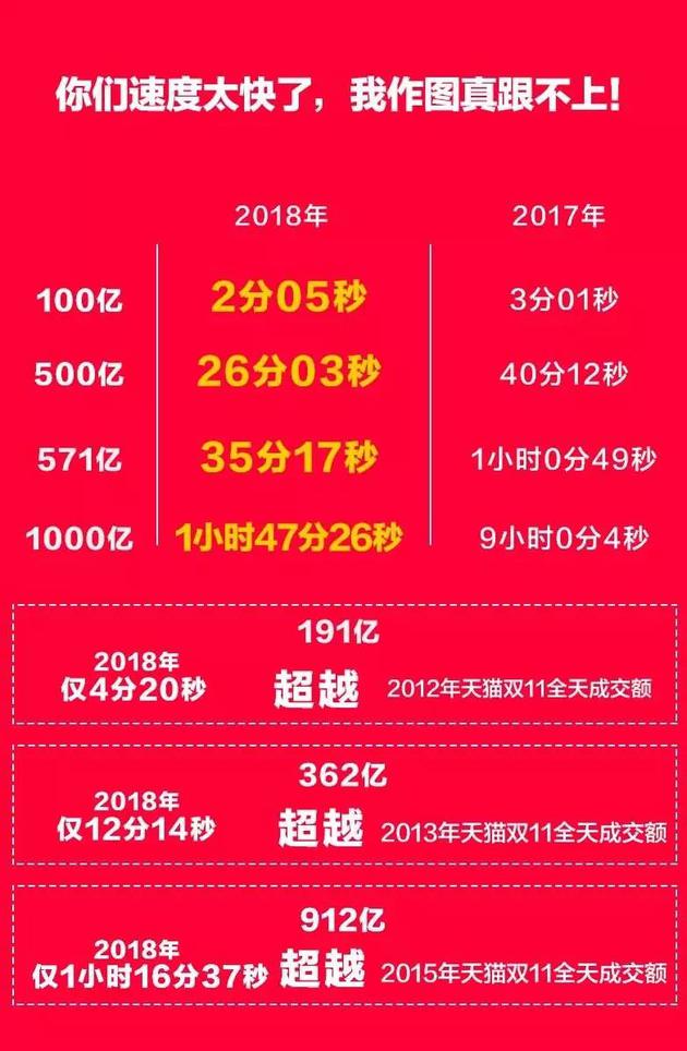 和往年一样,今年又创造了新的成交记录:0点后第一分钟、第一小时的成交额、交易峰值一秒内的并发订单等记录不断被打破;18万个品牌参与,截至22点,共有210个品牌成交额过亿,去年双11这个数字是167家;技术升级改变消费体验,通过指纹和刷脸方式完成的支付占比达到60.3%;全天实时计算处理峰值达到每秒17.18亿条;线上线下全面融合,全国逾20万新零售门店和100个重点商圈被天猫双11全面点燃……
