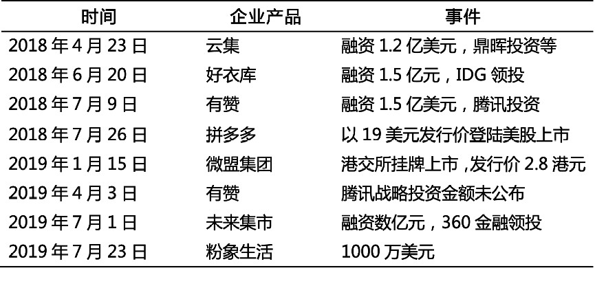 我们先来看看资本方面对社交电商的态度,以下是2018~2019社交电商大笔投融资及上市的情况: