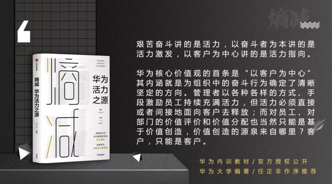 华为的“奋斗者”是有明确定义的,核心价值观的三句话有严密的内在联系和内在逻辑,离开了任何一句都是残缺的、不完整的:艰苦奋斗讲的是活力,以奋斗者为本讲的是活力激发,以客户为中心讲的是活力指向。然而,“以客户为中心”才是价值观之纲、之本,怎么反复强调都不过分!我读黄卫伟老师的《以客户为中心》《以奋斗者为本》《价值为纲》三本书,最深的体会是,任总实在是位“捣糨糊大师”!将近30年任总讲话数百上千次,花样、用词来回变,但从没离开这三句话和“坚持自我批判”,尤其“以客户为中心”这句话,大概是讲的频次最多、频率最高的。今天回头看,华为30年的成功无疑与此有绝大关系。
