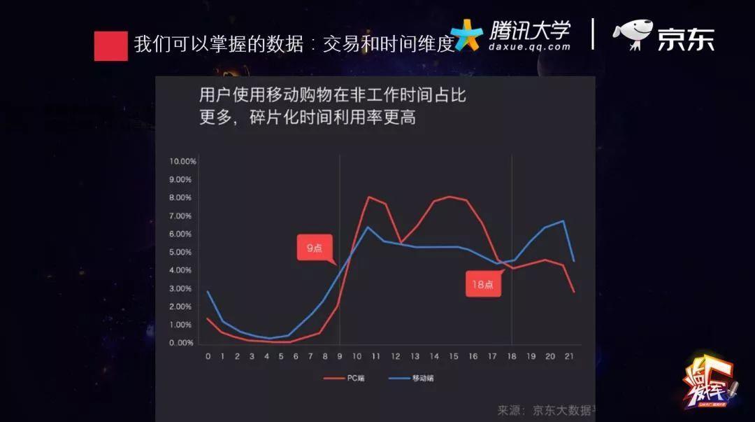 PC端下单曲线展示一个用户典型的生活与工作的时间流程。凌晨,用户睡觉了,6点钟起床,8点钟在上班路上,这时下单量较小。但是,到了10-11点,会拉起一个采购的高峰,因为用户可能处理完了手上的第一批邮件,需要喘一口气,正好上京东去消费一下。