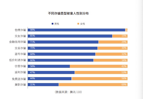 这或许会扭转外界的刻板印象,但腾讯公司8月7日发布的《电信网络诈骗治理研究报告》指出,以性别来计,超6成网络诈骗受害人为男性,被害人性别男女比例分别为63%、37%;以年龄来区分,18-28岁之间受害人所占比例高达54%。