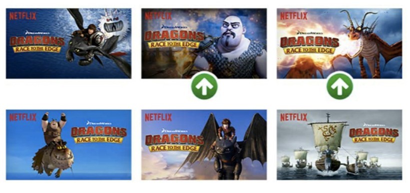 此后,Netflix开发了一套系统,能够自动将具有相同背景,但不同剪裁、装饰、标题、长宽比等元素的图像组合在一起,拼成一张海报,然后分别测试用户对这张海报的点击转化率和后续行为,最终挑选出转化率最高的海报。