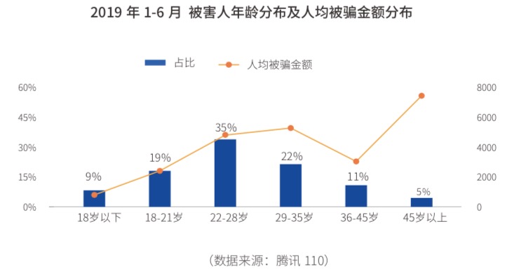 19-28 岁的年轻人在被害人中所占比的比例高达 54%,虽然这届 90 后是互联网原著居民,但由于主力网民的基数较大,因此成为被骗概率最高的群体。