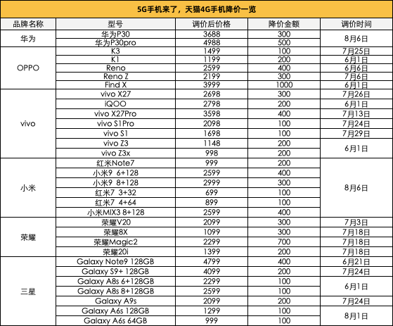 天猫商城方面告诉南都记者,近段时间天猫商城中30余款4G手机启动降价,其中不乏今年新发布的4G旗舰手机如华为P30系列、vivo 的IQOO、三星S9等,降价区间由100元到1000元不等。其中vivo、三星降价机型最多,分别达到7款,OPPO Find X价格最高下调1000元,而荣耀 Magic 2也降了700元。