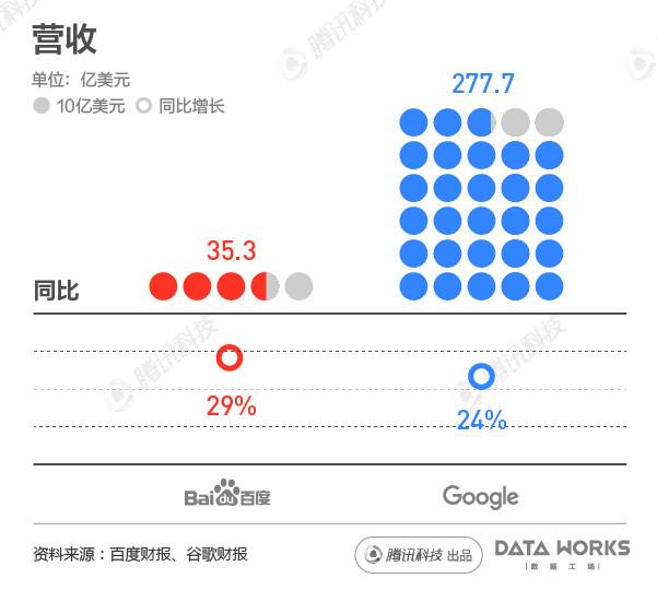 首先,从营业收入来看,百度同期营业额为35.3亿,而谷歌却达到了277.7亿,同样差不多七倍。