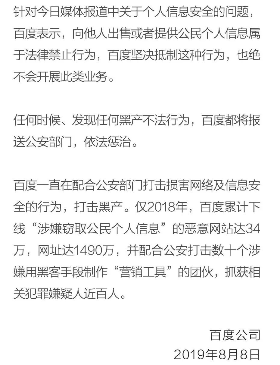 8月8日,针对新华社报道的个人信息泄露问题,百度方面发布回应称,向他人出售或者提供公民个人信息属于法律禁止行为,百度坚决抵制这种行为,也绝不会开展此类业务。