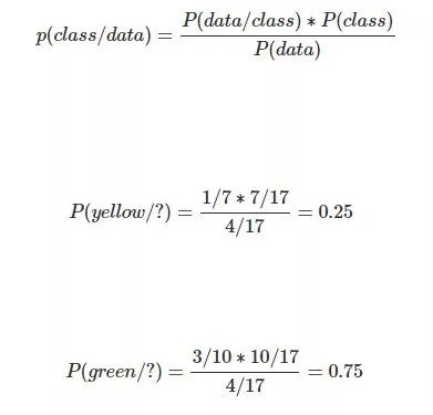某一点归于后验概率高的类别,因为从上可知其属于绿色类的概率是75%根据其75%的概率这个点属于绿色类。