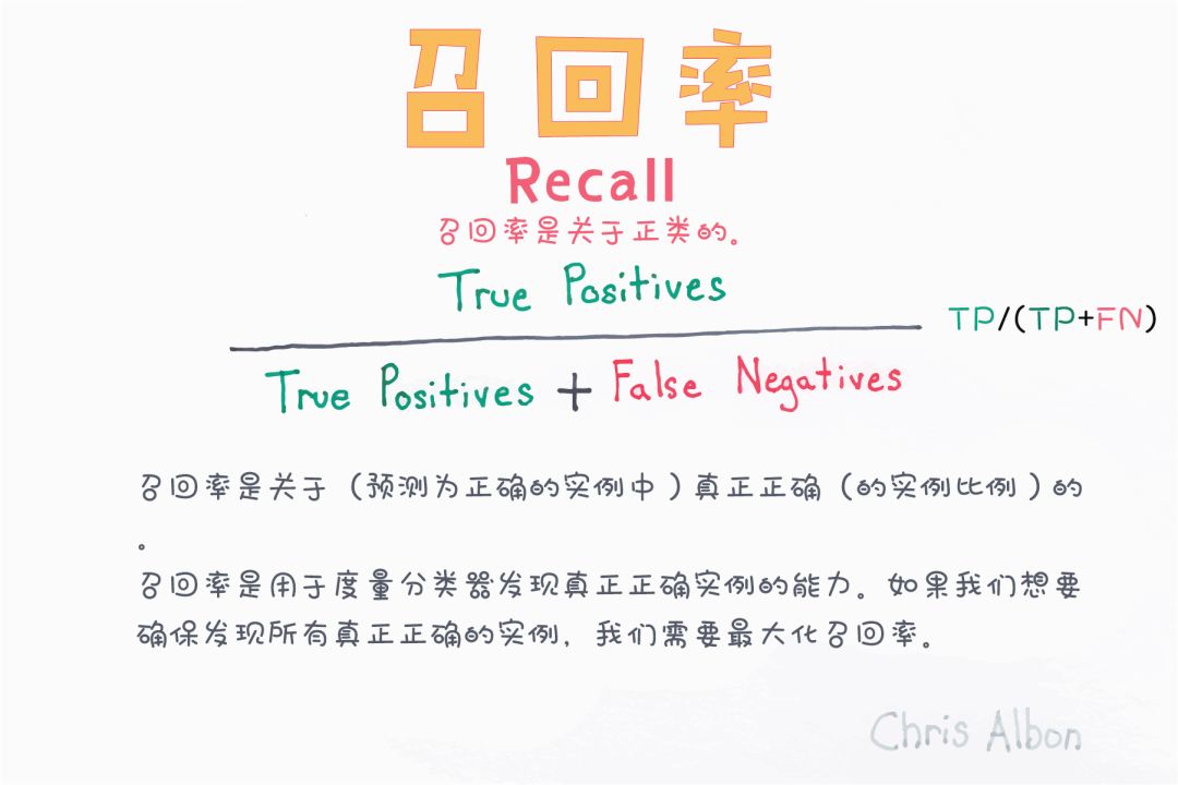 召回率是指在所有预测为正例(被正确预测为真的和没被正确预测但为真的)的分类样本中,召回率是指预测正确的程度。它,也被称为敏感度或真正率(TPR)。