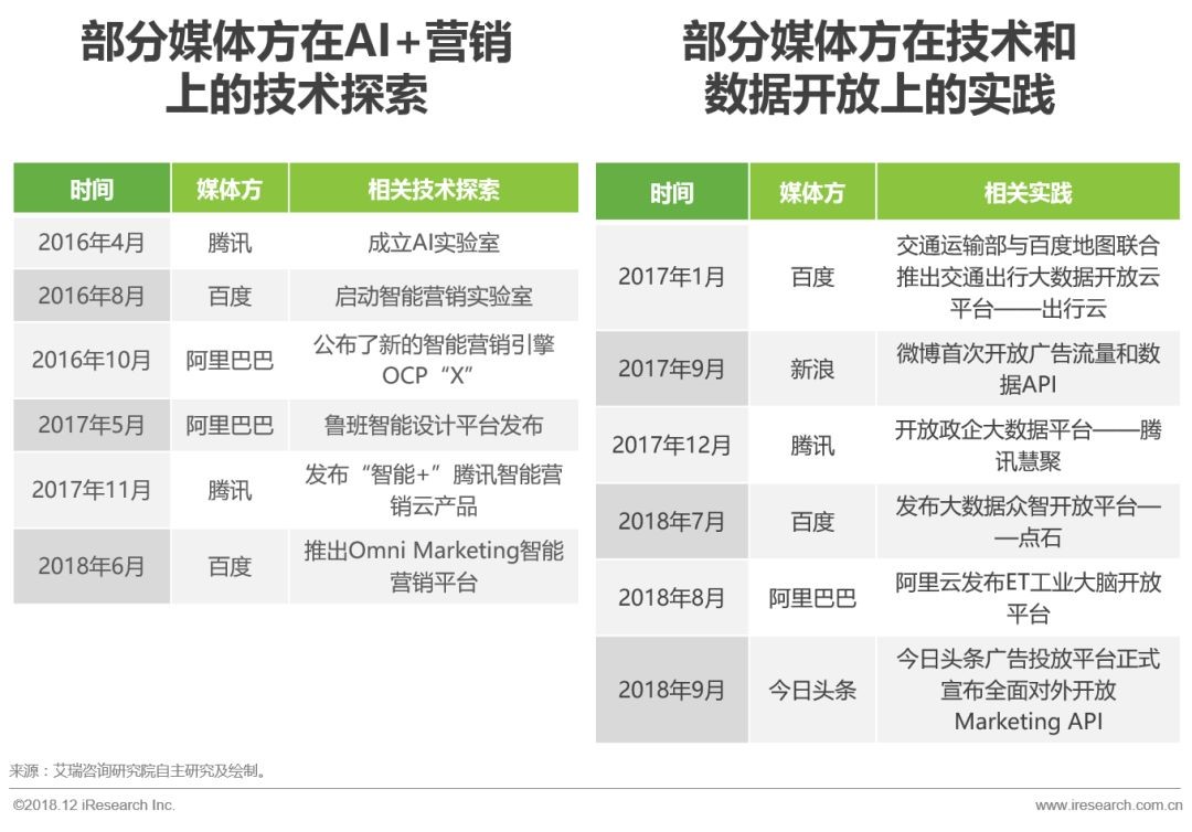 根据艾瑞发布的《营销趋势解读:AI+营销的发展及落地》显示,在AI+营销市场产业链上,用户数据和处理用户数据的AI技术是产业发展的核心,也是产业中各方话语权的立足之本。相比广告主和第三方服务商,以腾讯、百度为代表的媒体方更有能力自主研发AI技术支持营销体系。