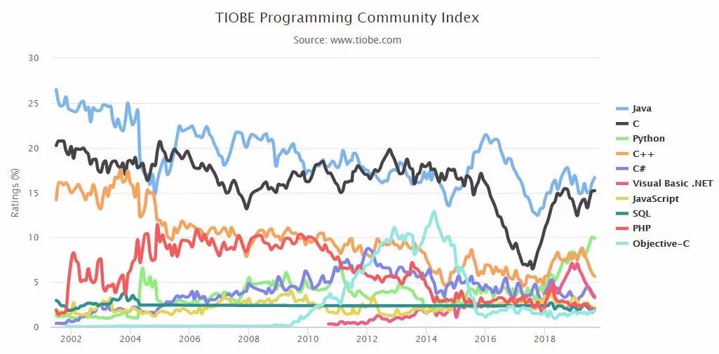 Top 10 编程语言 TIOBE 指数走势(2002-2018)