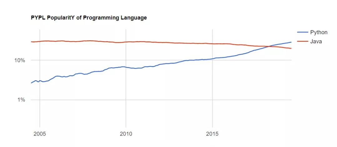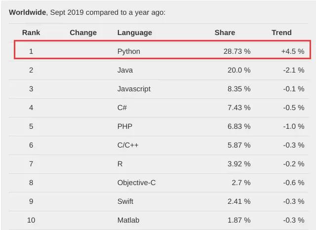 前五名分别是 Python、Java、Java、C# 与 PHP。相比去年 9 月份的数据,除了 Python 大幅上涨了 4.5%,Java 下降 2.1%,PHP 下降 1.0%,榜单中其它语言份额都没有多少变化。值得一提的是,前十中只有 Python 份额上涨了。目前 Python 以 28.73% 的份额领先于第二名占有 20.0% 份额的 Java,而第三名 Java 仅占有 8.35%。