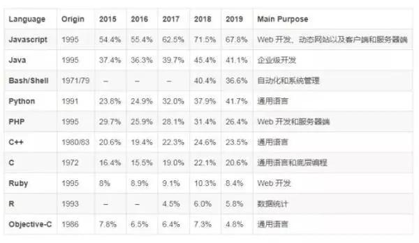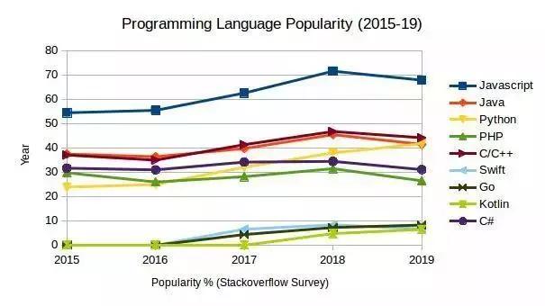 下面提供的两个表格总结了过去五年(2015-2019)里编程语言的流行趋势。该数据来自 2015-2019 年的 Stackoverflow 人气调查。