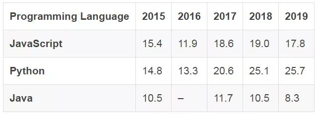 从上表中可以看出,近几年,开发者更希望学习Python和Java这两种编程语言,而Java却在不断下降。