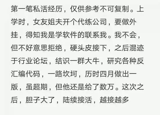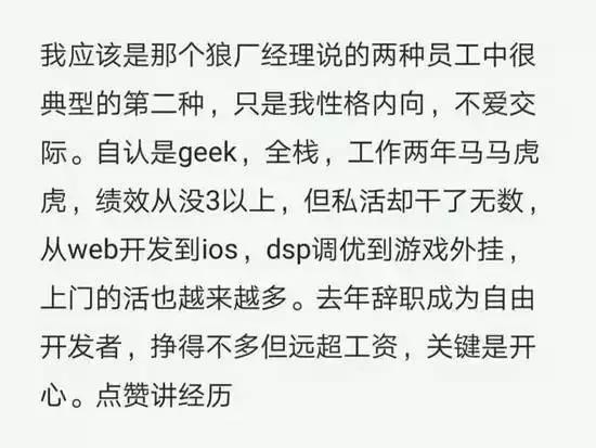 有程序员发出了这样的动态:工资一年20万,私活一年八十多万,真感觉本职工作失败。一些网友看到迅速来了兴趣:那你还上个什么班,还不如把时间用来扩展业务;趁有关系,赶紧拓展业务,干票大的,还打啥工,浪费时间,机不可失。