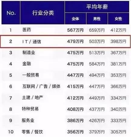 根据日本的一些调查得知,日本各行业平均年薪如上图所示,其中IT行业排名第二,仅次于医药行业,男性的年薪普遍比女性高,但女性IT行业职员也能拿到398万日元的年薪(约为人民币27万)。