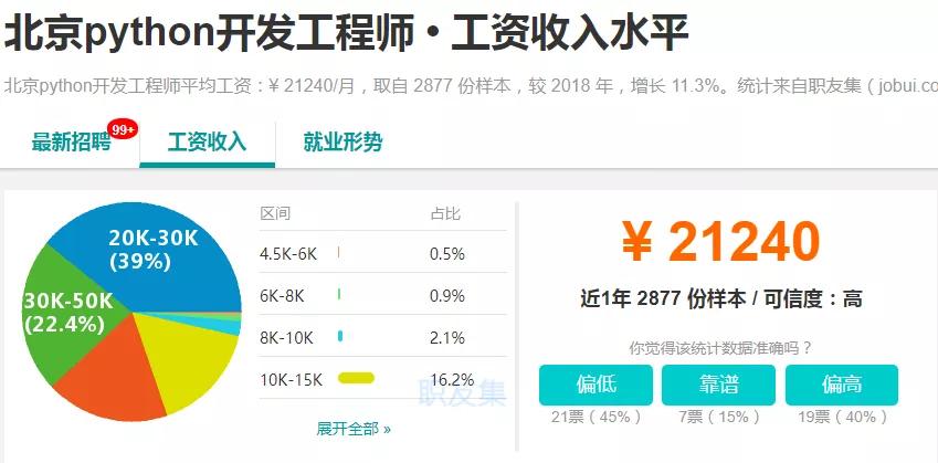 - 后端开发岗位是大户,是目前所有Python岗位里面需求量最大近一半,需求数量是爬虫工程师的10倍
