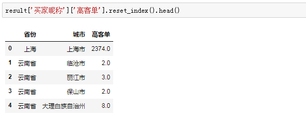 这样得到的结果包含了层次化索引,受篇幅限制就不展开讲,我们只要知道要索引得到“高客单”列,需要先索引“买家昵称”,再索引“高客单”: