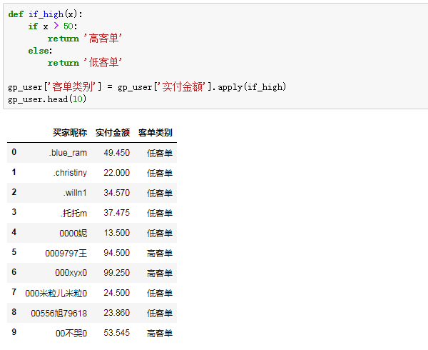 接着,定义一个判断函数,如果单个用户平均支付金额大于50,就打上“高客单”的类别,否则为低客单,再用apply函数调用: