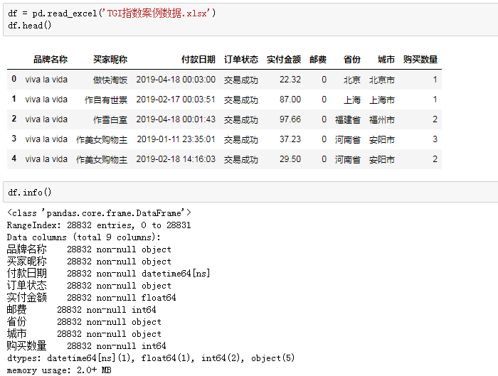 订单数据包括品牌名、买家姓名、付款时间、订单状态和地域等字段,一共28832条数据,没有空值。