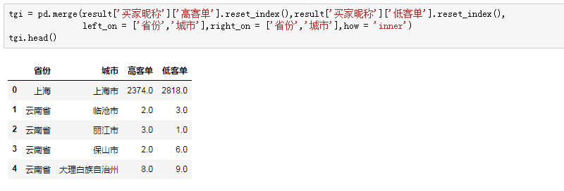 这样,拿到了每个省市的高客单人数,然后再拿到低客单的人数,进行横向合并: