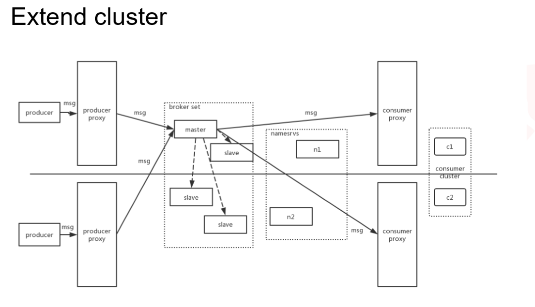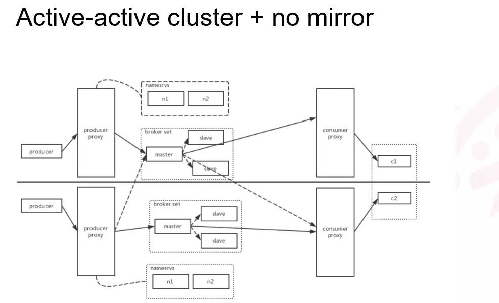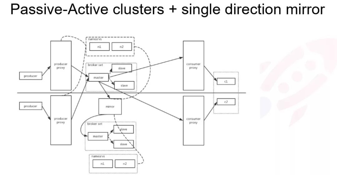 这是 master 和 slave 跨机房去部署的方式。因为我们有一层 proxy ,所以可以很方便的去做流量的调度,让消息只在一个主机房进行消息写入,不需要一个类似中控功能的实体存在。
