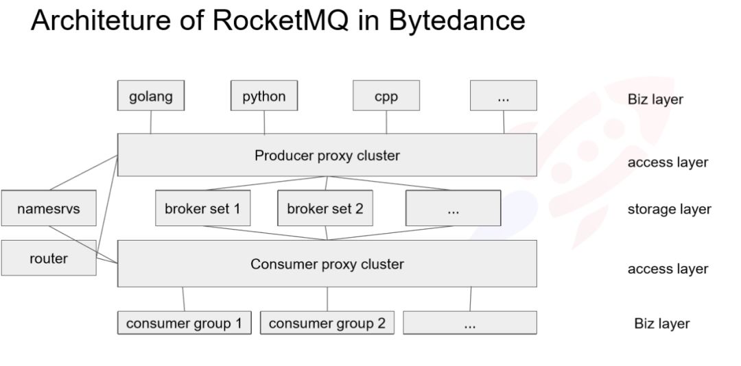 今日头条的服务大量使用微服务,容器数目巨大,业务线繁多, Topic 的数量也非常多。另外,使用的语言比较繁杂,包括 Python,Go, C++, Java, JS 等,对于基础组件的接入,维护 SDK 的成本很高。
