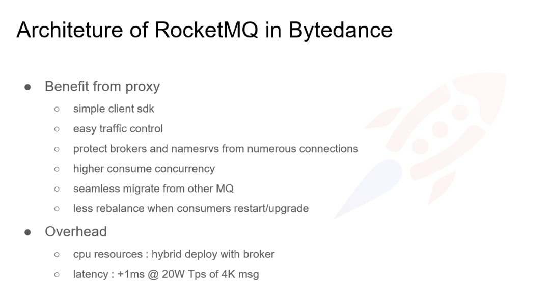 以上是我们通过 Proxy 接口给 RocketMQ 带来的好处。因为多了一层,也会带来额外的 Overhead 的,如下: