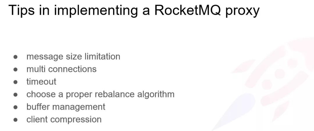 特别提醒一下, Proxy 拉消息都是通过 Slave 去拉,不需要使用 Master 去拉, Master 的 IO 比较重;还有 Buffer 的管理,我们是遇到过这种问题的,如果只考虑 Message 数量的话,会导致 OOM ,所以要注意消息 size 的设置。