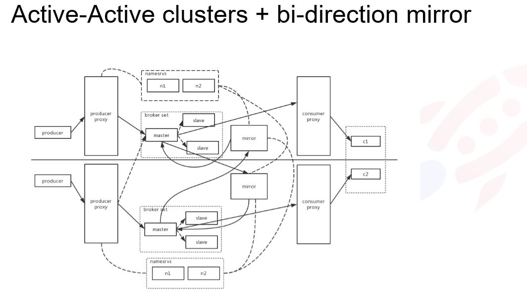 第三种方案:双写加双向复制的架构。这个结构太复杂不好控制,尤其是双向复制,其中消息区回环的问题比较好解决,只需针对在每个正常的业务消息,在 Header 里加一个标志字段就好,另外的 Mirror 发现有这个字段就把这条消息直接丢掉即可。这个链路上维护复杂而且存在数据冗余,其中最大问题是两边的数据不对等,在一边挂掉情况下,对于一些无法接受数据不一致的是有问题的。