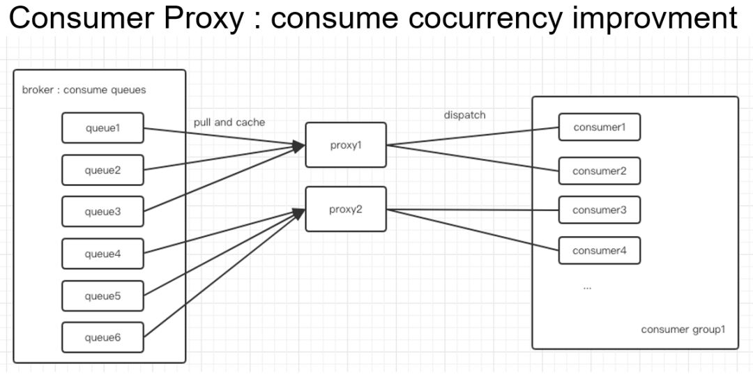4,通过 Proxy ,多了一个代理,在消费不需要顺序的情况下,我们可以支持更高的并发度, Consumer 的实例数可以超过 Consume Queue 的数量。