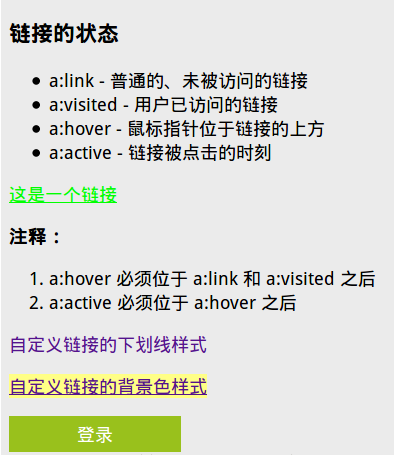 <!--能够设置链接样式的 CSS 属性有很多种(例如 color, font-family, background 等等)。链接的特殊性在于能够根据它们所处的状态来设置它们的样式。-->