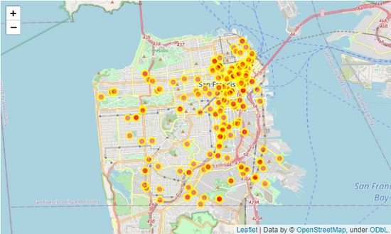import folium import pandas as pd san_map = folium.Map(location=[37.77, -122.42], zoom_start=12,width='50%',height='50%') # cdata = pd.read_csv('https://cocl.us/sanfran_crime_dataset') cdata = pd.read_csv('Police_Department_Incidents_-_Previous_Year__2016_.csv') #犯罪数据,包含犯罪所在经纬度 # get the first 200 crimes in the cdata limit = 200 data = cdata.iloc[0:limit, :] # Instantiate a feature group for the incidents in the dataframe incidents = folium.map.FeatureGroup() # Loop through the 200 crimes and add each to the incidents feature group for lat, lng, in zip(cdata.Y, data.X): incidents.add_child( folium.CircleMarker( [lat, lng], radius=7, # define how big you want the circle markers to be color='yellow', fill=True, fill_color='red', fill_opacity=0.4 ) ) san_map.add_child(incidents)