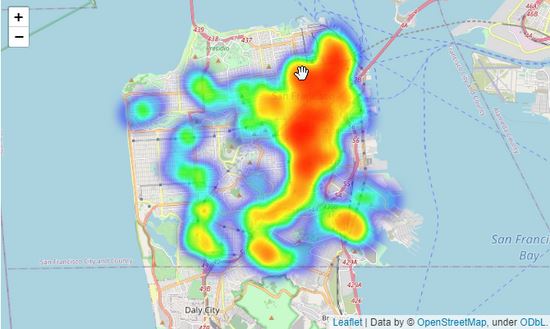 from folium.plugins import HeatMap san_map = folium.Map(location=[37.77, -122.42], zoom_start=12,width='50%',height='50%') # Convert data format heatdata = data[['Y','X']].values.tolist() # add incidents to map HeatMap(heatdata).add_to(san_map) san_map