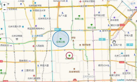 folium.Circle( radius=300, location=[39.928614,116.391746], popup='北海公园', color='crimson', fill=False, ).add_to(m) folium.CircleMarker( location=[39.942143,116.382590], radius=50, popup='后海公园', color='#3186cc', fill=True, fill_color='#3186cc' ).add_to(m)