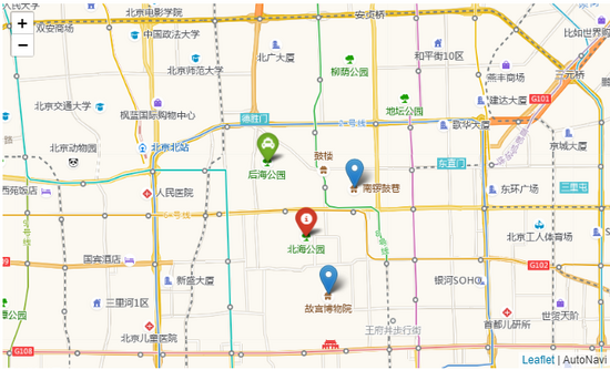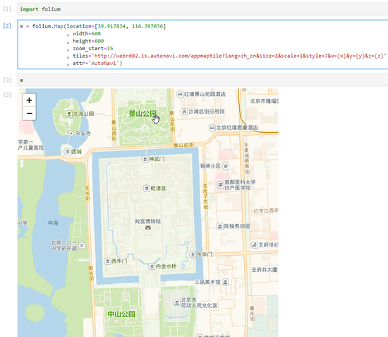 import folium m = folium.Map(location=[39.917834, 116.397036], zoom_start=13, width='50%',height='50%', zoom_control='False', tiles='http://webrd02.is.autonavi.com/appmaptile?lang=zh_cn&size=1&scale=1&style=8&x={x}&y={y}&z={z}<ype=6',attr='AutoNavi') tooltip ='请点击我查看该点信息' folium.Marker([39.937282,116.403187], popup='南锣鼓巷',tooltip=tooltip).add_to(m) folium.Marker([39.917834,116.397036], popup='故宫',tooltip=tooltip).add_to(m) folium.Marker([39.928614,116.391746], popup='北海公园', tooltip=tooltip, icon=folium.Icon(color='red')).add_to(m) folium.Marker([39.942143,116.382590], popup='后海公园', tooltip=tooltip, icon=folium.Icon(color='green', prefix='fa', icon='taxi')).add_to(m) m