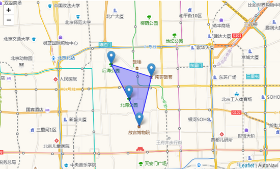 folium.Marker([39.917834,116.397036], popup='故宫').add_to(m) folium.Marker([39.928614,116.391746], popup='北海公园').add_to(m) folium.Marker([39.937282,116.403187], popup='南锣鼓巷').add_to(m) folium.Marker([39.942143,116.382590], popup='后海公园').add_to(m) folium.Polygon([ [39.917834,116.397036], [39.928614,116.391746], [39.942143,116.382590], [39.937282,116.403187], ],color='blue', weight=2, fill=True, fill_color='blue', fill_opacity=0.3).add_to(m)