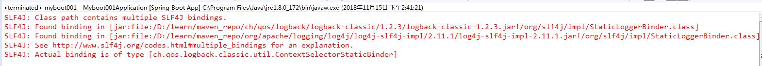 本例使用了两个spring-boot-starter-data-redis和spring-boot-starter-jdbc依赖,且它们也都有日志框架的依赖,排除默认框架时,只需将写在最前面的starter依赖中添加排除默认日志框架的代码即可