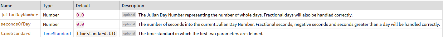 其中:julianDayNumber 是指整数天,因为是从公元前4713年开始计数的,所以这个数可能会很大;secondsOfDay 是指这一天过了多少秒;timeStandard则是指所用时间的标准,Cesium中主要有两种 Cesium.TimeStandard.TAI(国际原子时间标准)和Cesium.TimeStandard.UTC(协调世界时时间标准,这和JS中的时间标准是一样的)。