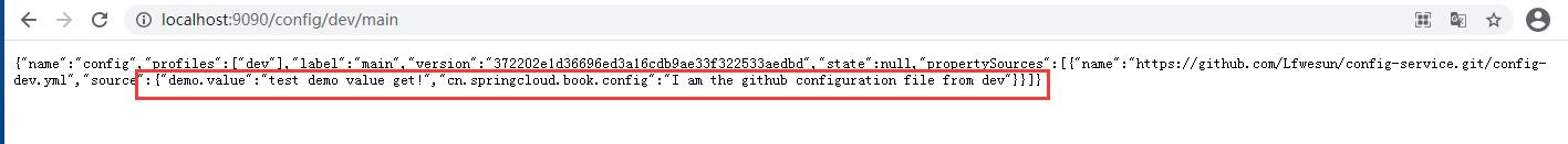 启动项目后,访问http://localhost:9090/config/dev/main 即可以看到配置信息 这个地址要注意的是 http://localhost:9090/{配置文件名前缀}/{环境类型}/{仓库分支标签}
