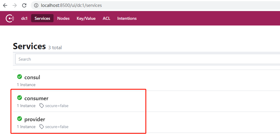3.运行消费者和提供者服务,Consul管理页面将显示对应的服务信息: