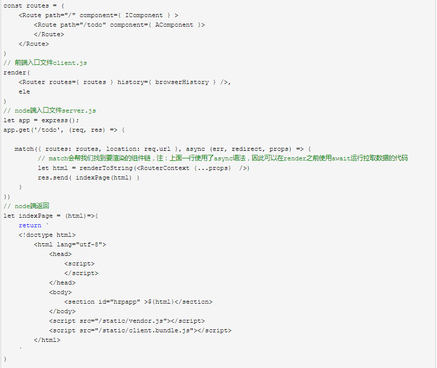 7.前端的react-router路由与node端路由如何配合?node如何知道该路由是渲染哪个数据呢?答:前端是以前的react-router配置,node端是react-router的match/RouterContext// 共享文件routes.js