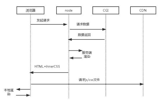 1. 请求一个html -> 2. 服务端请求数据( 内网请求快 ) -> 3. 服务器初始渲染(服务端性能好,较快) -> 4. 服务端返回已经有正确内容的页面 -> 5. 客户端请求js/css文件 -> 6. 等待js文件下载完成 -> 7. 等待js加载并初始化完成 -> 8. react-dom( 客户端 )把剩下一部分渲染完成( 内容小,渲染快 )。
