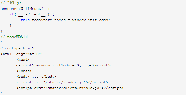 4. 拉取数据后如何处理呢?答:先在node端根据数据渲染好,再把数据随页面返回至前端,再由React根据数据进行渲染校对( 若前后端渲染结果不一致将报错 )。应该在componentWillMount让组件进行本地的数据同步