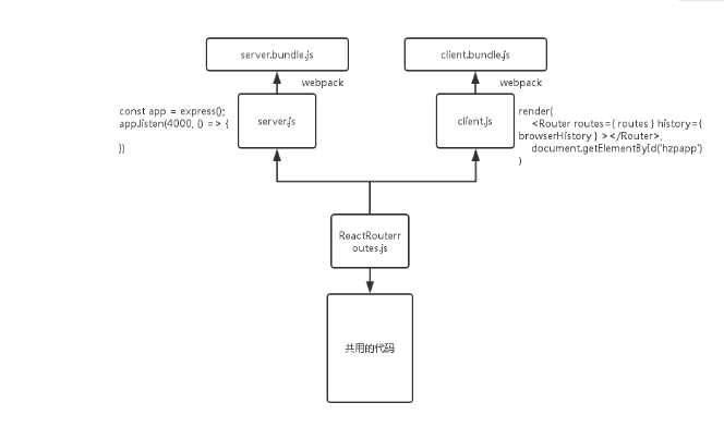 1. 前端/node端共用那部分代码?答:node端/前端有各自的入口文件,server.js/client.js,通过react-router的路由配置文件routes.js作中间层