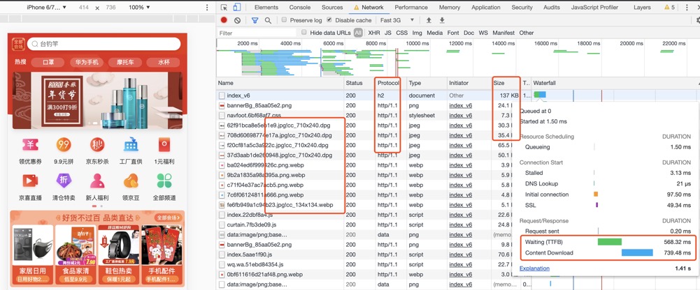 - 从网络资源加载情况来看,图片没有启用 http2,因此每次可以同时加载的图片数有限,未被加载的图片有等待过程