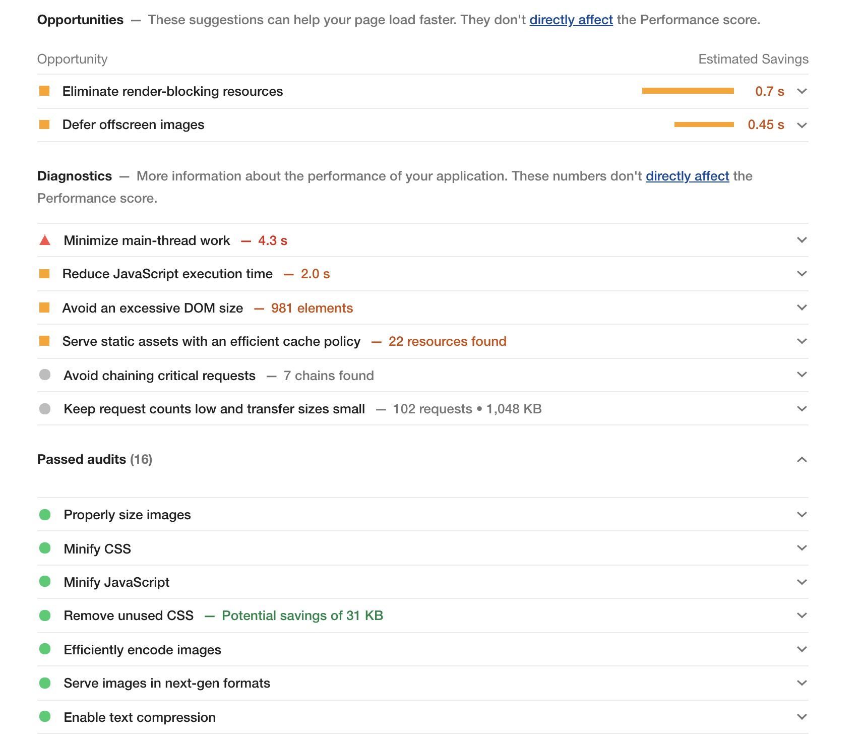 性能建议主要分为3类, Opportunities 可优化项、手动诊断项、通过的审查项。本次的例子如下图: